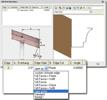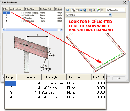 A - Thickness - this option will not be available if it has been set as "Has Fixed Thickness" under the Design Rules tab of the Roof Slab Style. B - Vertical Offset - this value basically moves the Roof Slab up and down parallel with the wall or perpendicular to the ground but can be confusing when mixed with the Thickness Offset value on the Design Rules tab because that value controls the vertical origin of the offset. C - Horizontal Offset - this should be an easy one to comprehend; you are just moving the Roof Slab back and forth on the plate line. This option is also affected by the Thickness Offset on the Design Rules tab - see comments for B - Vertical Offset. Edges - this cell, when picked, activates the Roof Slab Edges dialog box illustrated in the upper right and discussed below. Use this tool to Add or Modify edges for such things as fascia boards and gutters. Rise - Run - Slope - see Add Roof Slab Properties Palette above. Hold fascia elevation - this drop-down list offers three choices for holding the Fascia Elevation fixed on the Vertical axis. Use "By Adjusting Overhang" when you are trying to keep the seat cut the same ( note: this actually only works correctly if you move the pivot point to the inside of your plate). Use "By Adjusting Baseline Height" when you want to keep the same exact fascia and overhang but are willing to drop the Roof Slab ( or rafter ) down to achieve this result ( a deeper seat cut ). Use "No" when you just want the Roof Slab to pivot naturally off the Pivot Point with no formulaic interference. |