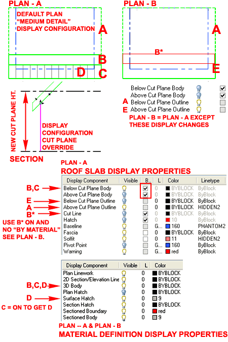 ![]() Plan - A uses the Above Cut Plane Outline ( A ) Display Component to create a simple dashed outline. This Display Component uses no Materials so you can set the desired linework appearance right on the Display Properties dialog as illustrated by the "Hidden2" Linetype setting. The Below Cut Plane Body ( C ) has been displayed and uses a Material Definition. On the Display Properties dialog for the current Roof Slab Material Definition, I show that the 3D Body ( B,C ) Display Component controls the appearance of this linework but since it represents the "body", you automatically get the Cut Line regardless of how this Display Component has been set on the Roof Slab Display Properties dialog. The Hatch is controlled by the Surface Hatch ( D ) Display Component on the Material Definition's Display Properties and is part of the 3D Body Display Component. Plan - B uses the same general settings as Plan - A, except that the Below Cut Plane Body has been replaced by the Below Cut Plane Outline ( E ) Display Component. This produces a cleaner outline with no option for a Surface Hatch. If desired, you can activate the display of the Cut Line ( B* ) by turning this Display Component On and deactivating the "By Material" setting. |