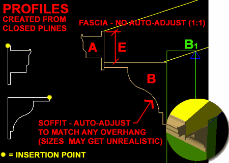 Illustrated to the right I show some quick sketches of a gutter and fascia board and a soffit trim assembly. The dialog box and values used to create this image come from the Design Rules tab discussed above, right. To create your own Fascias and Soffits, you will need to draw these items in profile or cross-section with the Pline command. The shape you create must be contiguous and closed. The orientation illustrated must also be used; i.e., they must face right. Use the Profile command to Define these items and use appropriate Insertion Points ( see yellow dots, left ). The fascia object is attached to the top of your Roof Slab so if you want a gutter or other item down a bit, you can copy my example or simply select an insertion point above your Pline object. The Soffit object must be a separate Profile Style. Once created, you can attach them to your Roof Slab Style as discussed above under the Profile drop-down lists. In the illustration to the right, I left the custom gutter and fascia board in a 1:1 ratio and thus made sure to have A - Auto-Adjust to Edge Height off. For the Soffit, I wanted it to work for a variety of different overhangs, so I set B - Auto-Adjust to Edge Overhang Depth on. This can create unrealistic proportions but saves a lot of time. I also used the Offset from Fascia insertion option, E - "Y" Direction, to cut the rafter tails 6" ( 152mm) from the top. I made the gutter solid because there's no way to easily cap the gutters and I find that open gutters are more noticeable than solid ones. It all depends on what you plan on doing with your efforts; render or cut detailed sections. |