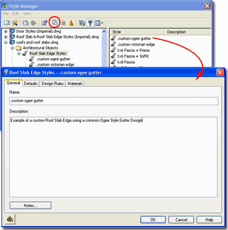 For Roof Slab Edges Styles, you can use the Style Manager to load, modify, delete and create new Roof Slab Edge Styles. Since Roof Slab Edge Styles are rather simple and don't have Display Property settings, starting from Scratch when making a new one is as viable as using the Copy/Paste option that I recommend for most other Object Styles. Assigning Materials is probably the biggest obstacle you will have to deal with when working with the Roof Slab Edge Styles dialog box. Illustrated to the right, I show the process of creating a New Roof Slab Edge Style that I have Named ".custom ogee gutter". By double-clicking on this new style, you will invoke the Roof Slab Edge Styles dialog box - as illustrated. The General tab provides access to the Name and Description fields for a Style; plus access to the attachment of Notes but no Property Sets since these will be attached to Roof Slabs. I used the name ".custom ogee gutter" to demonstrate how to create a simple Roof Slab Edge Style that creates the look of a standard gutter. You can expand on this information to create extremely sophisticated Soffit and Fascia design options. |
