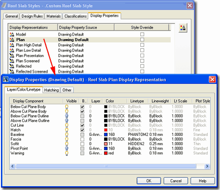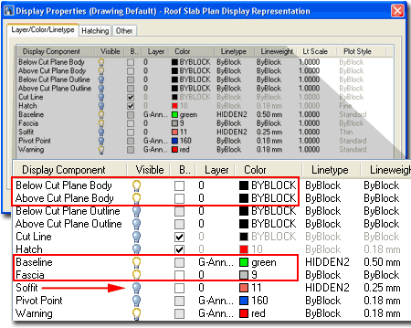 The Display Properties tab of the Roof Slab Styles dialog box, illustrated right, provides access to the display characteristics of the components of your Roof Slab objects; from Visibility to Cut Plane Height overrides. This is also where you would go to have Roof Slabs change color or Materials, for example, when you switch from one Display Configuration to another. See the discussion on Roof Slab Display Properties below for more information on this subject.