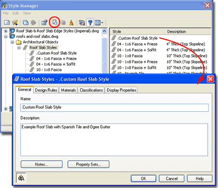 For Roof Slab Styles, you can use the Style Manager to load, modify, delete and create new Roof Slab Styles. Though you can easily create New Roof Slab Styles from Scratch using the New button, you may want to use the Copy/Paste technique instead because it is far easier to Modify Settings of an existing Object Style than it is to create one from Scratch. In some cases, you may even miss specific settings that can come back to haunt you much farther down the road on a project - things like Display Representations or Data for Schedules. Illustrated to the right I show the process of creating a New Roof Slab Style that I have Named "Custom Roof Slab Style". By double-clicking on this new style, I show that I have also activated the Roof Slab Styles Properties dialog box where all of the custom settings can be made for the size, shape and look of this particular object style. The General tab provides access to the Name and Description fields for a Style; plus access to the attachment of Notes and Property Sets. |