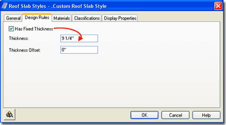 Styles - Design Rules tab On the Design Rules tab of the Roof Slab Styles dialog box, illustrated to the right, you will find a checkbox that locks the A - Thickness value field on the Properties Palette and two Thickness options.