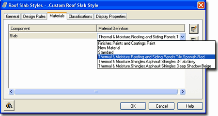 The subject of Materials is one of the most expansive and confusing topics in Architectural Desktop because it requires a complete comprehension of the product in order to take full advantage of this feature; from object styles to display representations. This subject will be discussed under Part 1 - Display and in the Presentation eGuide. Illustrated to the right I show that Roof Slabs will offer one predefined Component ( Slab ) and that the Material Definition Name will be set to "Standard" when you create a Style from scratch. If you have imported any of the Architectural Desktop Roof Slab Styles from the Object Style Library, you should find that you will be able to use the Material Definitions that come with those objects - as illustrated to the right where I am selecting Spanish Tiles.
