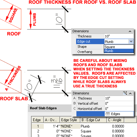 | Mixing Roofs and Roof Slabs Though it may seem obvious when highlighted, the illustration to the right did catch me off guard when cranking out some design work on a recent project where I used Roofs and Roof Slabs, where appropriate, for various solutions. The Thickness Value for Roofs is measured relative to the "Edge Cut" while the A - Thickness Value for Roof Slabs is always true regardless of the "Edge Cut". In other words, Roofs measure the fascia height while Roof Slabs measure the rafter depth. It's quite crazy isn't it. If you want to mix the two Roof Styles and match the thickness as well as the fascia heights, you'll have to do a little trigonometry.