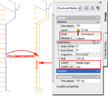 You can use a Structural Member Style for downspouts. First, create a Structural Member Style that meets the specifications for your downspout. Second, draw a profile of the downspout path in Elevation View as illustrated to the right. Third, use the "ColumnConvert" command to convert the Polyline into a Structural Member. Fourth, on the Properties Palette set the Style to your custom downspout Structural Member Style, set the Member Type to "Column" and adjust the Justify setting as required. You may find some minor graphical issues in the Plan View Display Representations but those can be corrected fairly easily. The most important change involves setting the Cut Plane Height to the top portion of the downspout; i.e., override the current display cut plane height. Be sure to read the full article on this trick for more information. |