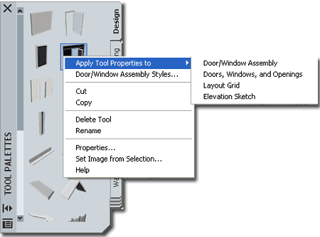 Properties to The Apply Tool Properties to> menu option, illustrated to the right, offers options that vary depending upon the Object Style the Tool is for. Some tools, such as those that simply insert an MvBlock or Hatch an area do not have this menu option. At one level this menu option acts much like a Properties Painter where you can "apply" settings from the Tool icon to existing Objects in the current drawing file. At another level, this menu option offers the option to "Convert To" or "Create From" feature that is missing from most of the alternate pull-down menus. Illustrated to the right I show how the Door/Window Assembly Tool offers the option to "Apply Tool Properties To>" a "Layout Grid" and an "Elevation Sketch". By Selecting either of these two options, you can Convert a 2D drawing or a Layout Grid Object into a Door/Window Assembly. Look for similar options under other Tools. |