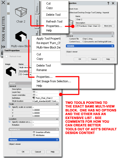 For Architectural Desktop Tools, there remains a unique variety that hasn't been fully integrated into the Tool Palette system and offers no Properties at all. You will find that most of these tools have duplicate tools under the Custom tab of the DesignCenter where they were created through the use of the AEC Content Wizard. Basically the AEC Content Wizard, likely to be phased out in the near future, is the predecessor to Tool Properties allowing users to embed ADT-specific functionality within a DesignCenter Object. Some Objects still do not have equivalent Tool Properties and thus remain locked in the old DesignCenter but as ADT evolves, these Properties will surely be migrated to the Tool Palette system. What advanced ADT users should be aware of, however, is that the AEC Content Wizard offers the awesome power to combine just about any script with ADT features. You can, for example, make a command that draws a simple AutoCAD line but keys it to an Layer in the current Layer Key; making it far more adaptable than locking it to one specific layer.