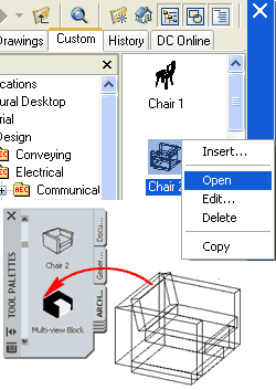 Illustrated to the left is a neat trick that you can employ to improve your Tool Properties for Design Content. From the DesignCenter, right-click over an Object such as an MvBlock and Select the Open menu option. Once the file has opened, Select the Object and Drag it directly to your Tool Palette. Close the file without saving any changes. |