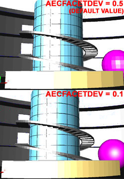listed here: AecFacetDev - ( FACETDEV ) - this variable is for Architectural Desktop objects only and has a huge impact on the appearance of curved AEC objects, from curved Curtain Walls to curved Roof fascias. The value is for the length of a chord along any curve so the shorter the distance ( smaller number ), the smoother the curve. The range is between zero and infinity and the default value is 0.5. You may find that you will need to use a value of 2 - 0.1 depending on what and how close you are Rendering. In some cases when converting AEC objects from Polylines, you may need to set this variable prior to the conversion; this is particularly true with Roof Slabs. Surftab1 - this is not a Display control but a tabulation setting for the creation of Surface objects in AutoCAD and Architectural Desktop. I have added them to this list for reference purposes in case you are also using Surfaces. The problem with these tabulation settings is that they cannot be set after the creation of a Surface but must be set prior to creating it. Surftab2 - see comments on Surftab1. This tabulation setting works for Surface objects that take two directions for tessellation; surfaces like EdgeSurf. |