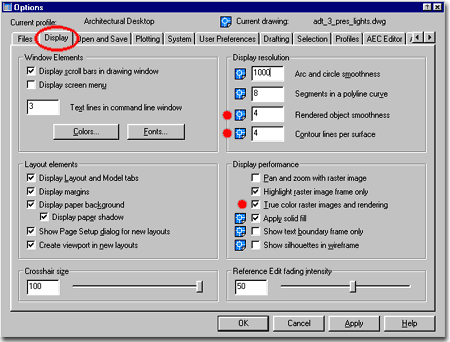 - Display tab On the Display tab of the Options dialogue box, illustrated to the right, there are several Display related options and settings that you can use to improve the performance or appearance of your 3D Modeling and Rendering work. Unfortunately, the performance aspect is usually inversely proportional to the appearance aspect so that a great looking Shaded Sphere, for example, also takes longer to turn while in 3D Orbit. The default settings, in my opinion, are unacceptable though so you should make some minor adjustments as outlined below. Display Resolution - See also Dynamic Tessellation setting. Segments in a polyline curve - ( SPLINESEGS ) - this variable affects Polylines only. It is best observed when using Pedit on Plines and using the Spline option to curve a jagged set of Plines. The range of values can be between -32767 and 32767.