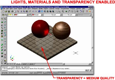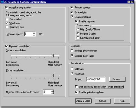 The 3D Graphics System Configuration dialogue box, illustrated to the right is accessed through the Properties... button on the System tab of the Options dialogue box ( discussed above ). On this dialogue box you can make some significant performance changes to the display of your 3D Modeling work; including activating Lights and Materials in Shaded Modes. Adaptive degradation - check this box to allow for degradation options. Maintain speed in FPS ( Frames per Second ) - this value sets the point at which degradation will occur. If, for example, a model has all render options on and is being rotated in the 3D Orbit tool but cannot maintain a speed of 5 frames per second while displaying full render options ( textures, etc., ), the jump will be made to Flat shaded or any other option set. Note about degradation: this is a really useful option if you are pushing your system to its limits. If you like working with Render options on and find that the model hick-ups a lot and moves too slow when you are changing display angles, views and so forth, use the degradation options. Start with Flat shaded before using Wireframe. For most of my work I usually use the Wireframe option as illustrated to the right. If degradation kicks in too early, set the Frame per second value higher. Dynamic Tessellation - use these options to control smoothness of 2D and