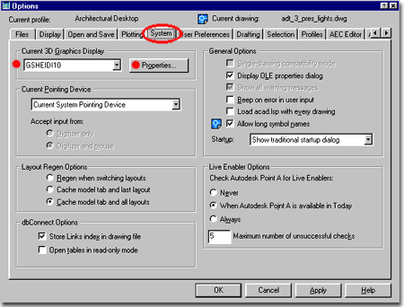 - System tab On the System tab of the Options dialogue box, illustrated to the right, you can use the Current 3D Graphics Display drop-down list to select other drivers or use the Properties... button to add one or make changes to the current driver configuration. The options you have depend greatly upon the configuration of the computer system you have and the type of video card that is installed. Though Autodesk claims that the AutoCAD kernel supports multi-threaded applications, the evidence as to the benefits appears negligible. I think it safe to say that the return on investment for multiple processors is far greater with products like 3D Studio Max and the new Autodesk Viz than with AutoCAD and its Flavors. Rendering in AutoCAD and Architectural Desktop is slow and will remain slow until a new Rendering engine is added. I have found that it is actually faster to run Architectural Desktop side-by-side with Viz. The Properties... button does provide access to some really cool options however so you should definitely take advantage of what there is to offer - see comments below. |