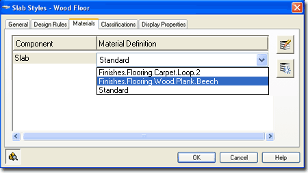 Material Definition Style to an Object Most of the Objects in ADT offer a Materials tab under the Style Properties dialog as illustrated to the right for Slabs. From this tab you can assign any Material Definition Style available in the current drawing file, create New ones or Modify existing ones.