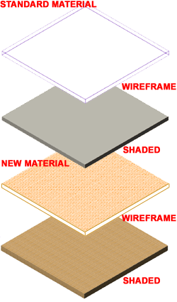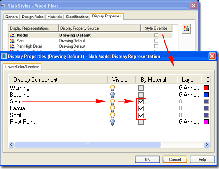 Illustrated to the right and left I show how the Model Display Representation of a Slab Object Style appears before and after a Material Definition Style has been Selected and set to control the Display Components. Illustrated to the right I show that in order for a Material Definition Style to affect an Object's Display Components, those Components must be set to use the "By Material" control. In essence, this setting defers local control over to the Material Definition Style. |
