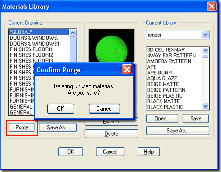 During the course of a project it is rather easy to accumulate undesirable data and Render Materials are no exception. Purging Material Definition Styles does not remove Render Materials. Illustrated to the right I show the only tool I have found that you can use to Purge Render Materials. Though Architectural Desktop's Render Materials are more sophisticated than AutoCAD's native Rendering Materials, you will find that they are referenced and used by the old AutoCAD Rendering Tools such as the Materials Library illustrated to the right. By typing "MatLib" you can activate this dialog and safely use the Purge button to remove all unused Rendering Materials. Be sure to avoid using the Delete button as that will actually remove Render Materials even if they are referenced by an active Material Definition Style. |