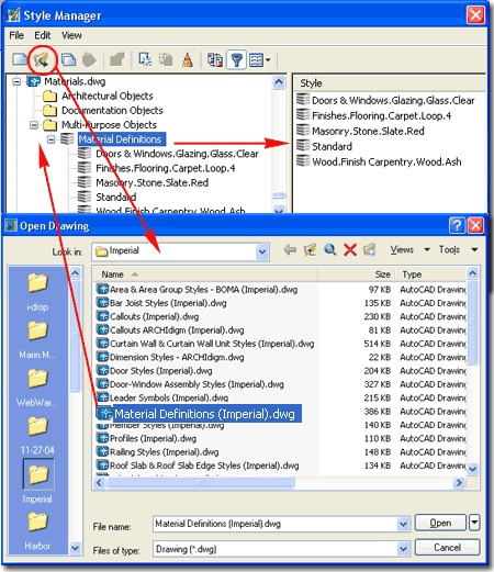 On a Network based installation of ADT, these Material Definition Styles should be on a captured drive (like "G:\offices standards") or similar location with a similar folder structure to that illustrated left (Content >> Imperial >> Styles >> Material Definitions (Imperial).dwg or (Content >> Metric >> Styles >> Material Definitions (Metric).dwg. In a very customized office scenario, these files may not even be present and others may have been designed for the Styles your office prefers (in this case, see your CAD manager). |