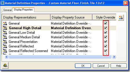 ![]() through every single individual Display Representation Override when creating new ones or modifying existing ones. There are no tools to expedite this work but you can save some time by creating a template; i.e., create one Material Definition Style that will serve as a master copy for all others that you plan to create. |