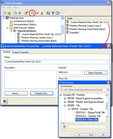 Creating and Modifying Material Definition Styles is actually fairly easy. Because they have been designed as Object Styles (a huge mistake in my opinion), you can apply much of the same logic to these "Objects" as you would with the Style Properties of most other Objects. Illustrated to the right I show the process of creating a new Material Definition Style that I have named ".Custom Material. Floor.Finish. Tile.12x12" (the use of periods is simply a grammatical format by Autodesk and you don't have to adopt it). Material Definition Styles, like Object Styles, can have Notes, Property Sets and Keynotes. This provides the means for assigning data to individual components within a single Object Style, like Walls. |