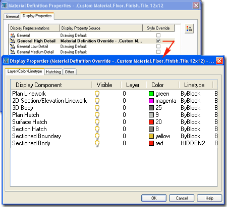 On the Display Properties tab for the example Material Definition Style discussed above, I show in the illustration to the right that I have set Style Overrides on every single Display Representation. This is a necessary step for every Material Definition Style because that is the only way to make them different from each other. Unlike Object Styles that may share a common set of Display Representations but vary based on Dimensional Properties, Material Definition Styles only have Display Representations as a means of providing variation. The Display Representations with a graphic black arrow in the upper left corner are simply copies of the "General" Display Representation. Those listed to the right come with the default Materials Definition Styles in ADT but you can also create your own using the Style Manager. Note: |