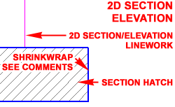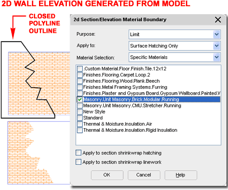 The Material Boundary tool can be used on 2D Sections and Elevations, as illustrated to the right, to "Erase" or "Limit" the amount of material or Hatching displayed. Because 2D Sections and Elevations are linked to the source model and act as single Objects ( like Blocks ), you will find options on the 2D Section/Elevation Material Boundary dialog box for isolating specific Material Definitions. |