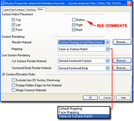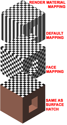 SURFACE HATCH PLACEMENT SURFACE RENDERING Mapping - use this drop-down list to Select one of three options for controlling how the Render Material is applied (mapped) to the surface of Objects. Default Mapping typically maps to the top surface and "bleeds" down the sides to create a look that is usually undesirable. Face Mapping maps to each face of the Object reproducing the same surface material ( or image) for all sides. This is usually the best default option. Same as Surface Hatch maps the Rendering Material according to the checkboxes set under the Surface Hatch Placement section. This is a rather useful option when you only want the material to display on one surface like on Spaces, Slabs and Roofs, for example. |