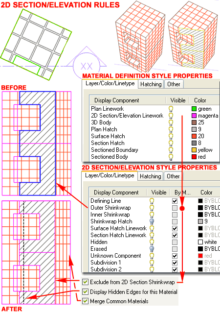 ![]() Surface Hatch - this display component was designed to control the Object Component's Hatch Pattern appearance in Views that display Surfaces; such as Model. You should find that this component is great for managing Hatch Patterns on Objects in 2D Sections and Elevations. Section Hatch - this display component was designed to control the Object Component's Hatch Pattern appearance when cut with a Section tool. When using Live Sections you are likely to see this component more clearly than in 2D Sections where the 2D Section Style may overlap this pattern with its own ( Solid Hatch by default ). Sectioned Boundary - this display component was designed to control the Object Component's outline when cut with a Section tool. I have yet to find any evidence that this option works on 2D Sections but it is quite evident on Live Sections. You may have seen it in action as the default red outline used by most of the Materials that come with ADT. Sectioned Body - this display component was designed to control the Object Component's hidden 3D Body appearance when cut with a Section tool. As with the Sectioned Boundary, I have only observed this option in Live Sections where you have to use the "AecToggleSectionedBody" command toggle in order to see this component.