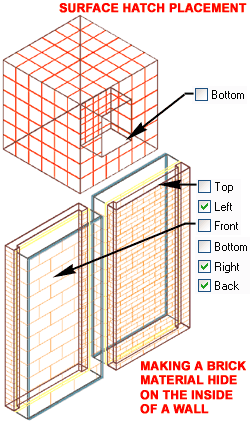 Faces - this drop-down list always offers two options but they will vary according to the orientation of the Face you Selected. If you Select a Back Face, for example, the two options will be "All back faces" and "Only selected back face". For Objects with more than six faces, such as those created from polygonal Profiles, you may have more than one Back Face and the "All..." option provides a means to affect these multiples at one time. The only problem I have with this is that what my eye perceives as similarly oriented faces is not necessarily how ADT interprets face orientation; i.e., just because they all face one way does not make them Back Faces. Hide Surface Hatching - this checkbox provides a simple way to remove the Hatch on a Selected Face. This setting affects 2D Section/Elevation results as well. |