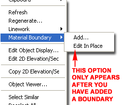 ![]() To employ this tool, you will need to draw a Closed Polyline object that will either Limit the Hatch or Erase it. This Polygon must be drawn over the 2D Section or Elevation as illustrated above. Select the 2D Section or Elevations, right-click, Select "Material Boundary" from the Context menu and cascade to the Add... option. When queried to "Erase Selected Linework? [Yes/No]", respond with a "Yes" since the Polyline can be accessed later via the "Edit In Place" option. The final set of options will be made on the 2D Section/Elevation Material Boundary dialog. To remove a Material Boundary, use the "Edit In Place" Context menu option and simply Delete the Polygon. |