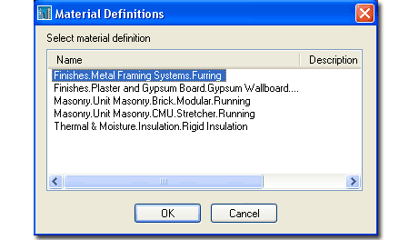 The "MaterialQuery" command can be used to list all of the Material Definition Styles attached to an Object which can be rather useful on more complicated Object Styles like Walls. Of course, you can get the same list simply by looking at the Materials tab of the Object Style but this option is fairly fast. For any Material Definition Style Name that you Select in the Material Definitions dialog, see right, you will get a "Total Volume" report on the command line (use the F2 key to see a larger text Window). Command: MaterialQuery |