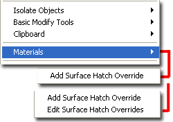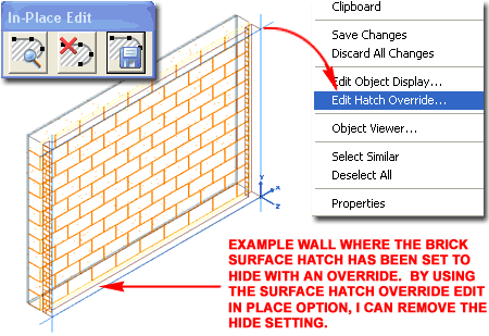 The Edit in Place option for Surface Hatch Overrides is only available for Surfaces that have Overrides on them - see discussion above. If you work with the Context menu, you will find that the Materials> cascading menu will offer a new option, "Edit Surface Hatch Overrides", when you have Selected a Surface that already has one or more Overrides. Illustrated to the right I show an example of how the Brick Surface Hatch Pattern was set to "Hide Surface Hatching" as part of an Override set earlier. Now that I want to change the Override, I have to use the "SurfaceHatchOverrideEditInPlace" command to get back to the Surface Hatch Override dialog. When you are in the "Edit-in-Place" mode, Select the blue rectangular or polygonal shape representing the outline of the current Surface, right-click and Select "Edit Hatch Override..." on the Context menu as illustrated to the right. This action will activate the same Edit Hatch Override dialog used to set the Override in the first place. |