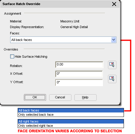 ![]() Rotation - use this numeric field or pick-points button to specify a unique angle for the Surface Hatch as it applies to the Selected Face. Do not confuse this option with the Angle setting for Surface Hatch on the Hatching Tab of the Material Definition Style Properties dialog. Though both produce similar results, this Rotation option is actually an override whereas the Angle option affects the Material for all cases. This setting affects 2D Section/Elevation results as well. X and Y Offset - use these two numeric fields to reposition the base or seed point of the Surface Hatch Pattern on the Selected Face. This is how, for example, you can move a Brick, CMU or other Tile Pattern Up and/or Over along a Surface. This setting affects 2D Section/Elevation results as well. |