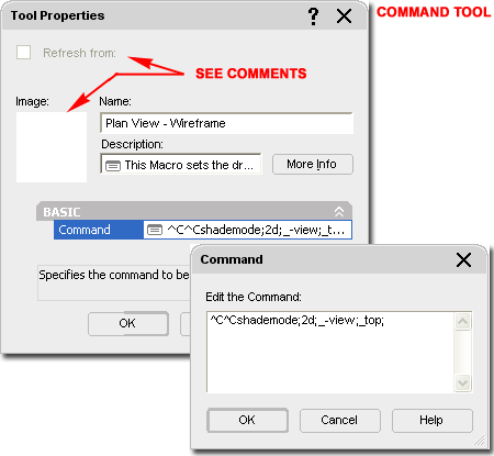 Command Tools cannot be created by dragging an Object to the Tool Palette so you will find that in order to create one of these Tool Types you will either need to drag it from the Content Browser or Copy an existing one. Command Tools are basically a direct duplicate of Tool Buttons despite the type of Tool you acquire when you drag a tool button to a Tool Palette. Tool Buttons, like Command Tools, can only do one thing: play a command script to the command line. When you write the command script you have to type everything exactly as you would when typing commands on the keyboard. With the aid of the menu language, DIESEL, you can use special characters to create more sophisticated scripts including options for user input. You can also include full LISP code or make calls to other programs written in LISP or VBA. Refresh from - this checkbox option is for Tools linked to a source Tool in a Content Browser Catalog. See discussion under Tool and Palette Refreshing for the full story.Image - this option is typically blank for Tools that are not directly associated with an Object. You can set custom images to make your own Tool icons. See discussion under Tool Images for the full story. Tips: