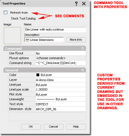 Command Tools with Properties are, as the name implies, Command Tools with a set of Properties including Color, Layer, Linetype, Linetype Scale, Plot Style, Lineweight, Text Style and Dimension Style. In addition to these Properties, Command Tools provide "Flyout" options that are a derivative of toolbar fly-out buttons. The Command String field of this Tool is identical to the Command field on the Command Tool and you can actually use "Command Tools with Properties" in place of Command Tools. Command Tools with Properties offer a list of Properties that may or may not relate directly to the action set by the Command String. Dimension Style, for example, is irrelevant for a Tool set to draw Lines, Arcs or Circles and should thus be set to "Standard" or "--current" to avoid importing unwanted settings. All of the Properties under the General section of the Tool Properties dialog are stored directly in the .atc file and as such, you can think of these settings as embedded in the tool itself; i.e., they are not stored in a drawing file. Refresh from - this checkbox option is for Tools linked to a source Tool in a Content Browser Catalog. See discussion under Tool and Palette Refreshing for the full story. Image - this option is typically blank for Tools that are not directly associated with an Object. You can set custom images to make your own Tool icons. See discussion under Tool Images for the full story. |
