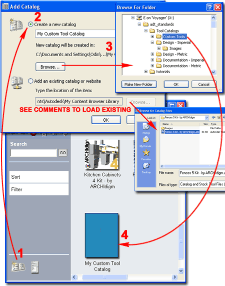 Though many users may never need to use the Content Browser's tools for creating custom Content, I recommend that all users become familiar with these tools because it is a great way to save a backup copy of your custom Tools and Palettes. Beyond just saving a backup copy, users and CAD managers will find all sorts of amazing managerial benefits in using the Content Browser; including path controls, linking and locked shared Palettes. Illustrated to the right I show the steps required to create a New Catalog in the Content Browser. When you pick on the "Click to add or create a catalog" button, the Add Catalog dialog automatically activates where you have two primary choices: "Create a new catalog" or "Add an existing catalog or website". Be sure to set the path information correctly on the first attempt whenever creating a Catalog because you cannot change this later. If you make a mistake, you can Delete the Catalog and create a new one but be aware that once the Catalog file has been created, the file will remain on your local or network system; i.e., to truly remove it you need to manually delete it with Explorer. New Catalogs can be set to read existing Catalog files in case you really get a disconnect that you want to thread back together. In most cases you will create a New Catalog that you will then populate with Tools that you organize as you see fit. This Catalog will either be located on the local machine in the default path location or in a folder on a network server where it can be shared with other users and workstations. In the illustration to the right I show that I have used the Browse... button to place my new catalog, "My Custom Tool Catalog", in the "Custom Tools" folder on my office server which has been mapped as driver letter "X". You can think of a Catalog as a file and as long as the names are unique, all Catalogs can reside within one folder; this can prove to be quite messy and difficult to sort through so you may want to consider a set of Folders for each custom Catalog.