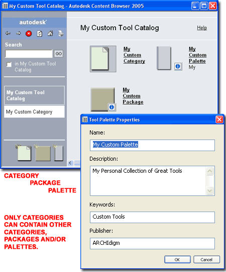 Organizational Objects Within a custom Catalog in the Content Browser you will find three organizational Objects that you can use to organize Tools: Categories, Packages and Palettes. If you don't want to use any of these Objects, you can drag-n-drop Tools directly to the Catalog's Cover Page. Category - use this "Object" to create something analogous to a page ( or sub-folder) with the option to use any of the three organizational Objects found on the Catalog Cover Page. You can see an example of this in many of the default Catalogs that come with ADT and it is useful for large Catalogs. Package - use this "Object" to store a collection of Tools that you may wish to drag directly to any existing Palettes you may have. In other words, it is a package ( or collection) of Tools for quick transfer. Only Tools can be added to a Package. Palette - use this "Object" to create an actual Palette Object that can be added to your current Tool Palette. Only Tools can be added to a Palette. When Palettes are added to the current Tool Palette, a new file is created - see comments under "Note" below. Regardless of how any Tool has been organized, you can always access a single Tool and drag it directly to any current Tool Palette. Note: |
