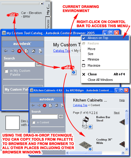Illustrated to the right I show some of the drag-n-drop options you have for copying Tools to and from the a Catalog in the Content Browser. By using the Context menu option for "Open in New Window" you can activate multiple Catalogs, Categories, Packages or Palettes to copy Packages, Palettes or individual Tools. Not that I feel completely comfortable about advising it, I did find that this is even possible between different versions of ADT. One of my favorite drag-n-drop actions is to take a Tool from a Catalog directly to the current drawing environment. This is particularly useful with Tools that you don't use regularly.
