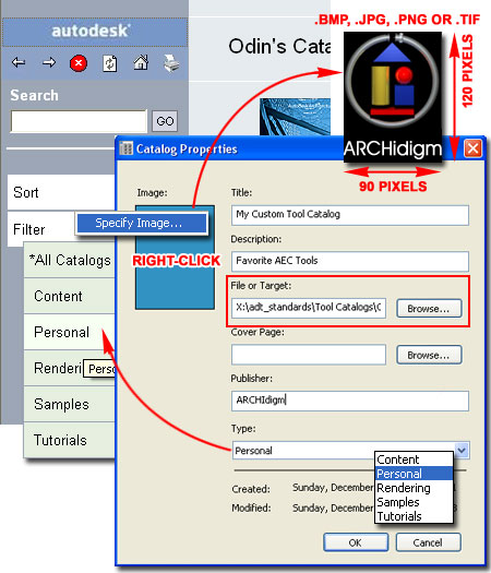 Content Browser Tools: Sort - use this option to rearrange the Catalogs by "...Last Used", "...Publisher", "...Title" and "...Type". Filter - use this option to limit the Catalogs displayed by "*All Catalogs", "Content", "Personal", "Rendering", "Samples" or "Tutorials" Catalog Properties: Title - Name of Catalog and Name of .atc file. If you name your Catalog "My Custom Tool Catalog", for example, you will find the file is named "My Custom Tool Catalog.atc". Be sure to limit the name so that the full path plus the name is less than or equal to 255 characters. |