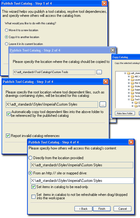For Architectural Desktop Style-based Tools, you can employ the Publishing tool to collate scattered Source Files and reset Paths to a new centralized Path location. Using the "Leave it in its current location" option helps to repair and update files and Path issues. Illustrated to the right, on the first dialog box of the Publish Wizard, I show that I am using the "Copy it to another location" which has become my most common choice because I find it creates a new and clean collection of files while leaving what I had in case something else goes terribly astray. I am a fan of redundancy when it comes to computers since it is rather easy to Delete Files and Folders. On the second dialog box of the Publish Wizard I show that I have chosen a Path on my Network Server (the "X" is a mapped drive). On my Server I have a single Folder for all "adt_standards" and under this Folder I have a series of Folders that include some I Copied from the default structure of ADT and some I created for custom use. In this group, as it relates to Content and Publishing, notice that I have a Folder named "Styles". This Folder's name is paramount to customized restructuring of ADT because the Tool Catalog Roof Path has been set to look for this Folder and any sub-folders. On the third dialog box of the Publish Wizard I show that I have chosen to Copy my source files to a custom folder ("Custom Styles") within the parent "Styles" Folder as discussed above. This will allow me to control the Path via the Tool Catalog Root Path setting on the Options dialog. You don't have to follow this formula but it does offer a little more flexibility and control. Automatically copy tool dependent files into the above folder to be referenced by the published catalog - this option provides a means to copy tool source files for Tools that import Style-based Objects such as MvBlocks, Walls, Slabs, Schedules and so forth. I was dumbfounded when I discovered that this only works with ADT Style-based Objects and not something as obviously useful as standard AutoCAD Blocks. Report invalid catalog references - this option is basically essential so you can check for errors and one of the most disappointing errors you may find when learning about publishing is that you cannot publish source files over files that have already been published; i.e., if the file exists the publisher will not write over it and this will be reported as an error. One fix is to use Explorer to Delete the previously published files. Set items in catalog to be read-only - this option will lock all Tool Properties inside the Catalog but those Properties only amount to things like "Name", "Description", "Publisher" and so on. It does not lock the Properties for the Palette, Package or Category within the Catalog. Ironically this means that a user cannot Delete individual Tools in a Catalog but they can Delete Palettes, Packages or Categories - this doesn't make any sense to me and you may want to consider using the "Read-only" Attribute for higher security.