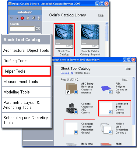 Not all Tools are Equal Not only can you drag-n-drop Objects to make new Tools, you will find a plethora of Tool Types throughout the default Palettes that come with ADT. Of the variety of Tool Types, you can basically categorize them into three groups: Command Tools, Command Tools with Properties and Object Tools. To me, Object Tools are really just Command Tools specifically designed to work with one Object Style. Since ADT has quite a collection of Object Style Types or Families you will find nearly as many Tool Types. For those few remaining Object Styles that don't have Tool equivalents, you will find that the DesignCenter and the AEC Content Wizard continue to be essential for their management - see discussion under Tool Palette and DesignCenter Content for more. One of the best ways to learn about the different Tool Types it to visit the Stock Tool Catalog in the Content Browser and add them to a custom Tool Palette where you can test and modify them. Illustrated to the right I show that I have accessed the Stock Tool Catalog and Selected the "Helper Tools" Category where you will find two of the most adaptable Tool examples: the Command Tool and the Command Tool with Properties. Recommended: |