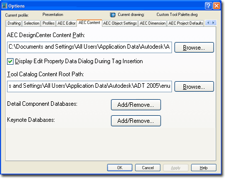 Content Root Path - Options dialog box Under the AEC Content tab of the Options dialog you will find a path field labeled "Tool Catalog Content Roof Path" with a Browse... button to help locate other paths. This path statement affects nearly all of the default Tools that come with Architectural Desktop. Because most Tools create Objects that are based on Styles, they have to point to a Source File to retrieve the Object Style and create an Object on your screen. If you think about this concept for a second you will realize that this could amount to a lot of Styles and consequentially a lot of drawing files that hold those Styles. You don't want this type of data scattered randomly about so the Path statement illustrated to the right provides the means to control a portion of all those Tool Paths from a centralized point. In essence, this Path statement offers users and CAD managers something close to a "relative path" structure between Tools and the Source Files that they need in order to function properly. I call this "close" to a relative path because the Path you set here is only a portion of the whole Path statement on each Tool. A default Imperial Door Tool, for example, comes from the following default Path location: "C:\Documents and Settings\All Users\Application Data\Autodesk\ADT 2005\enu\Styles\Imperial\Door Styles (Imperial).dwg". If you compare this Path statement with the default "Tool Catalog Content Root Path" statement (right) you will quickly see how far it points before stopping. And guess what, the Tool Path statement simply takes over from there. Getting back to the Imperial Door Tool example, this means that the Door Tool reads the "Tool Catalog Content Root Path" statement up until the last folder and then adds its own part for the final and specific Path location. In simple terms, the Path you set for the "Tool Catalog Content Root Path" statement is a variable in the full Path statement for all Tools that point to this Path location or folders below it (sub-folders). The example Door Tool has a Path that looks like this: <Style ref="%AECCONTENT_DIR%\Styles\Imperial\Door Styles (Imperial).dwg">. From the end of the "...\enu" Path statement which is saved as the variable "%AECCONTENT_DIR%", the Door Tool saves the remainder of the Path: "...\Styles\Imperial\...". As you can see, this forces you to work within the Styles folder if you plan to tinker with the Path statement for any or all of the default Style-based Tools. |