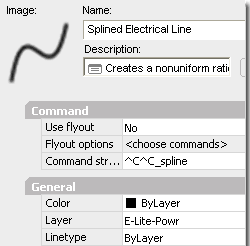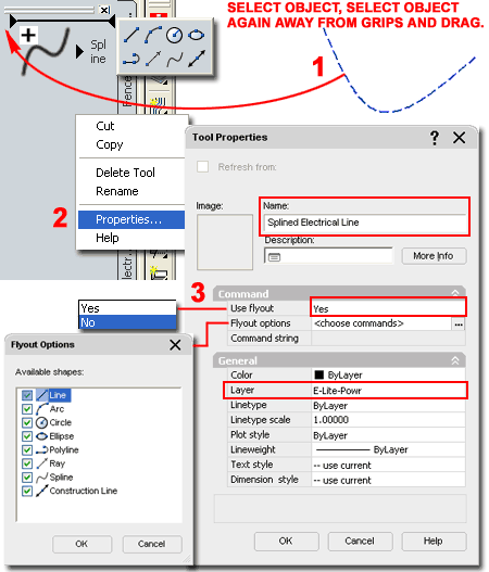 Illustrated to the right I show how you might go about creating a custom Tool for drawing electrical lines in Reflected Ceiling Plans. In Step 1 I show that I have Selected a Spline Object that I created earlier. In order to drag it, you have to Select the Object, release your mouse button and then look for a spot on the Object away from Grip Points and Select again ( right on the Object). For the second Selection of the Object, hold the left mouse button down as you drag the Object over to the Palette. Once over the Palette, continue to hold the left mouse button down but look for the small "plus" icon and the horizontal placement bar. When you see these two graphic indicators you can release the left mouse button and you should see a new Tool. When Objects are added to the Tool Palette by drag-n-drop methodology, they trigger a Tool creation related directly to the Object Type; a Spline Object will, for example, create a fly-out menu while a Wall will only create a specific Wall Tool. In this example I show that I don't want a fly-out menu so I have used the Properties... context menu option to access the Tool Properties dialog. On the Tool Properties dialog I show that I have used the "Use Flyout" drop-down list to set this value to "No". This action automatically resets the "Command String" field to "^C^C-spline" as illustrated above, left. One of the best reasons to use custom Tools for things as simple as electrical lines is that you can use the "Layer" value field to automate Layering. Unfortunately for ADT users, basic AutoCAD Objects, |