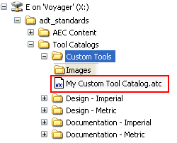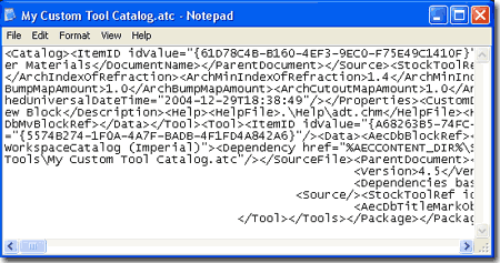 Properties A Catalog in the Content Browser is something similar to a Folder but when you look for it with Windows Explorer, you will find it listed as a unique file type with the three letter extension of ".atc." (autodesk tool catalog or something to that effect). This "catalog" has a unique set of Properties as illustrated to the right and serves as the primary container of Categories, Packages, Palettes and Tools (see discussion below).