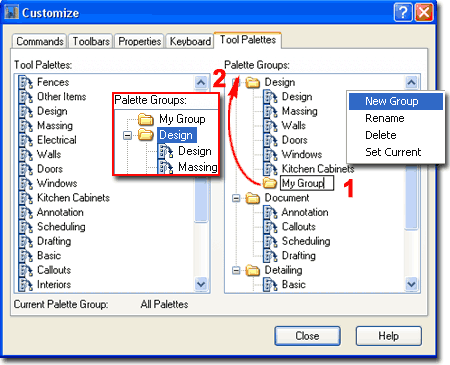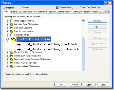 ![]() As you may already have figured out, you really have the freedom to create any new Palette with any New Tools that point to any location you want and you can keep the Palette anywhere you want as well. This is all ideal for those weird individuals who love to hide all their private CAD stuff in an office but it's a recipe for sending a CAD manager to the loony bin. The best structure for CAD managers is one that allows for contained yet mobile path locations; i.e., we'll put it all here but we may need to move it in the future. Working with information discussed here provides just that bit of structure to remain sane in the long run.