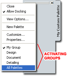 Illustrated to the right I show that I have created a New Palette that I named "My Custom Palette" and I dragged this Palette over to "My Group" created in the previous step. Once you have a custom Palette Group with at least one Palette, you can use the "Set Current" option from the context menu to make this group the only active one on the working Tool Palette. In the illustration to the left I show how this Palette may appear and how you can access your other Palettes (or "All Palettes") should you get nervous about losing the tools you are dependant on. |