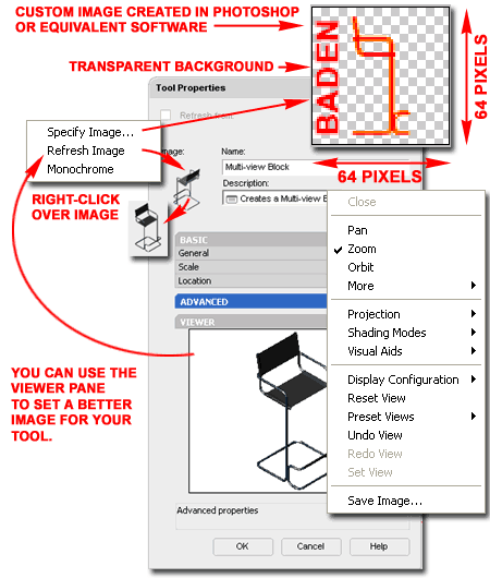 Tool Images When creating custom Tools, a Tool Image is typically created for you automatically based on the Object Style dragged over to the Tool Palette. Tools created by other means, such as Copying or dragging from the Content Browser may not display any Tool Image at all. Should you find that you need to create or modify the Tool Image, there are a variety of things that you can do but they all center on working with the Tool Image Context menu illustrated to the right. On this menu you will find three options: Specify Image..., Refresh Image and Monochrome. Specify Image... - use this option to access the "Select Image File" dialog where you can Select any .bmp, .jpg, .png, .gif, or .tif image on your local or network drive. Once you have Selected a custom image, this image will automatically be copied to the Images folder under the current Palette Location. Custom Images should be no less than 64x64 Pixels but I have had acceptable success with smaller and larger images. If you decide to create a custom image with Photoshop or equivalent software, it is best to use the 64x64 Pixel dimension and be sure to have a transparent background for all areas that will blend in with the Palette - see illustration upper right. Refresh Image - use this option in conjunction with the Viewer Pane and 3dOrbit Context menu to reset more desirable views, angles, perspectives and so forth. For Objects that have a definitive Right and Left side, such as exterior Walls, you may need to use this technique to get the exterior side to show as you wish it on the Tool. Monochrome - use this option to reduce the current Tool Image to a Grayscale image. Not all images will offer the Monochrome option and I have found that not all images convert to monochrome even when the option is available. This typically occurs when custom Blocks have been used in Object Styles. |