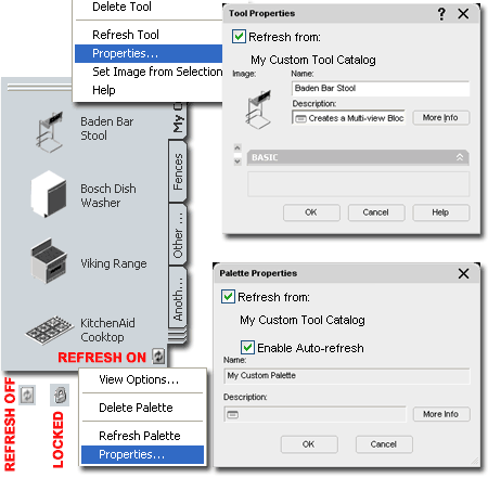 and Palette Refreshing When working with Tools and Tool Palettes you may have noticed references to "Refreshing". This option only exists for Tools and Tool Palettes created by interaction with the Content Browser (such as dragging them over). Because Tools and Tool Palettes can be linked back to their origin in the Content Browser, Refreshing provides users with the option of updating individual Tools or full Tool Palettes at their own convenience. By working with the Properties dialog for Tools and Tool Palettes, in conjunction with Publishing options for Content Browser Catalogs, users and CAD managers can set rules to lock, automate or open Tool Refreshing. These options provide the means for an office to have standard Tools that are locked, Template Tools that are flexible and "disposable" Tools that are completely open for independent management by individual users. Be aware that Refresh options are affected by several settings and actions that may prove to be a bit confusing. To make matters worse, I have found on several occasions that Tool and Tool Palette settings do not properly update until ADT has been shut down and restarted. If you spend a good deal of time playing around with all of this .XML code, you may even cause crashes or odd things like losing all of your Tool Images. Keep a clear head about what you are doing and observing and it should remain fairly logical. Remember that a Palette or Tool created on a local machine under the current user Profile is likely to exhibit different characteristics than Tools or Palettes dragged over from the Content Browser. If you mix and match haphazardly, for example, you may find Tools that exhibit different characteristics on a single Palette ( like Locked, able to Refresh, or with no Refresh option at all). Refresh from [Tool Properties] - use this checkbox to force a Refresh action, toggle the "Refresh Tool" option on the Tool's Context menu and lock the Tool as "Read-only". Tools not created from the Content Browser will not have a refresh option because refreshing is an action tied to the Content Browser. Tools dragged over from the Content Browser may have the "Refresh from" checkbox preset (checked) depending on how the Catalog was Published but if you uncheck and recheck this box, you force the Tool to "Read-only" mode. Once a Tool is locked to "Read-only" mode, you cannot restore it to a previous state. This means that you have to bring a new copy of the Tool from the Content Browser if you want another state. Tools dragged over as part of a whole Palette are affected by the Refresh settings for the Palette; i.e., if a Palette is set to Refresh so too are all of the Tools. |