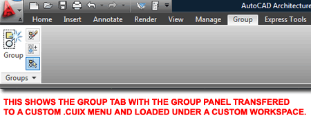 the Acad.cuix file Though you could transfer the Group Panel straight from the acad.cuix file into the aca.cuix file, I don't like to advise practices that could cause major problems. Instead, I recommend that you simply create a custom .cuix file whenever you want to customize the menu system in AutoCAD or AutoCAD Architecture. In the illustration to the right I show how easy it is to create a custom .cuix file that I named "group.cuix". To access the Customize User Interface dialog box, type "Cui" on the command line and go to the "Transfer" tab. After creating a custom .cuix file in the right pane, Open the acad.cuix file in the left pane and look for the "Home - Groups" Panel under the Ribbon folder. When you locate this Panel, drag it over the the Panels folder under the Ribbon folder of your custom .cuix. Save your custom .cuix file to any logical location so you can keep track of it. This could be the start of more customization so don't name it "group.cuix" like me.