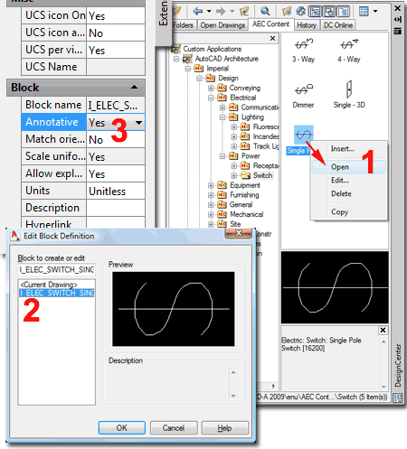 Options? If you want MvBlocks to ignore the Annotation Plot Size you can use the "AecCreateContent" Wizard to set the "Additional Scaling" to "None". To make this work you have to place the results under the Aec Content Folder so the DesignCenter will read it as Aec Content. From the DesignCenter, you can drag your MvBlock to a Tool Palette but the price for all of this effort is an MvBlock with no Properties; as is the case with most of the MvBlocks that come OOTB with ACA. In the case of mixing Annotative Blocks with non-Annotative Blocks in Multi-View Blocks, I don't believe there is any workaround solution. You can, however, make fairly good use of 2D Annotative Blocks in Multi-View Blocks. You can also improve upon existing content such as that illustrated to the right. In the illustration to the right I show that I have located the Single Pole switch in the DesignCenter, Opened the File, activated the Block Editor (type "Bedit") to edit the switch Block so I can set the Annotative Property to "Yes". Once this drawing has been saved and closed, the MvBlock will exhibit Annotative behavior. |