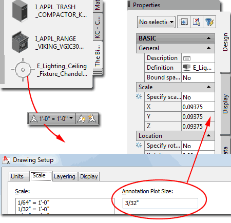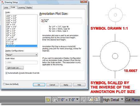 How to size a symbol for use in ACA A long time before Annotative Scaling was possible, Architectural Desktop, offered something similar that would scale specific objects according to a single value under the "Annotation Plot Size" field in the Drawing Setup (type "Units") dialog. The system was pretty good but had two significant problems: it could only scale objects upon insertion, not after, and most of the objects were drawn at some odd scale that forced most Imperial users to work with a scale of 3/32". This system, though in direct conflict with Annotative Scaling, remains in tact along with the 3/32" scale which forces you to create new content 32/3 (or 10.6667) times larger than what you really want in a 1:1 environment. In other words, you have to make your Blocks larger in order to allow the tool to reduce them when they are inserted. In the illustration to the right I show how I created the ideal sized drawing of a 2D Light Fixture and then scaled it up by 10.6667. |